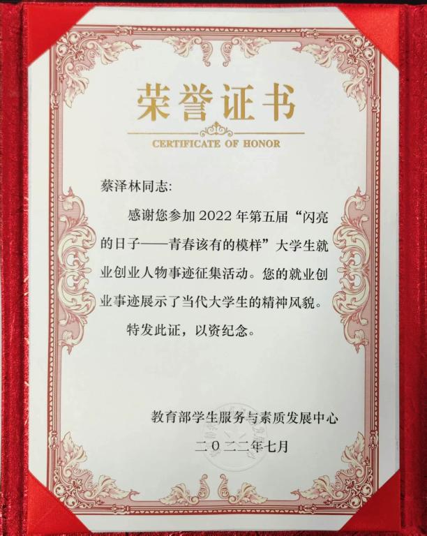 近日,由教育部学生服务与素质发展中心主办的第五届“闪亮的日子——青春该有的模样”大学生就业创业人物事迹征集推选结果公布,永利推荐的机电工程学院2021级电子信息工程专业学生蔡泽林脱颖而出,荣获全国“军营大学生战士”荣誉称号,全省共有5人获此殊荣。