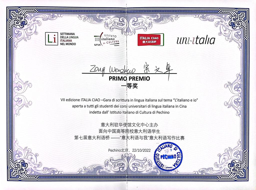 10月22日,第七届全国“ITALIA CIAO/意大利语桥”大赛在北京圆满落幕,本届大赛的主题是:“意大利语与我”,以写作大赛的形式举行。外国语学院选手宗文卓,凭借扎实的意大利语专业实力,摘得本科组大赛桂冠,这是永利选手继2015年喜得一等奖后再次获此殊荣。