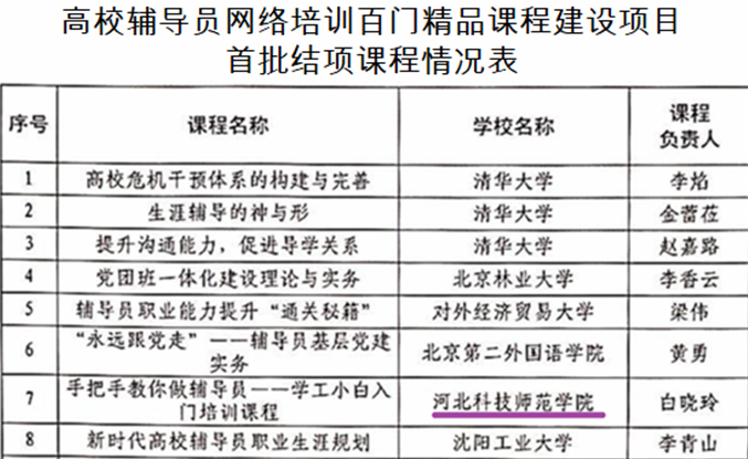 图为高校辅导员网络培训百门精品课程建设项目首批结项课程情况表