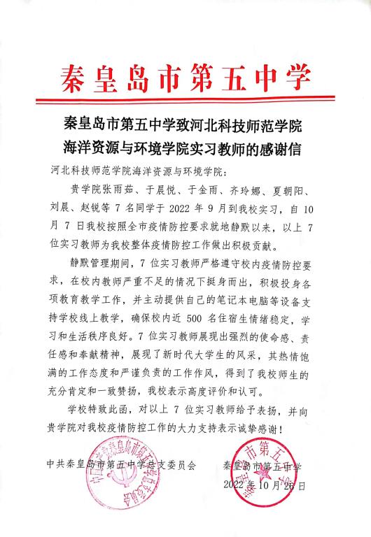 近日,秦皇岛市第五中学向永利发来感谢信,对海洋资源与环境学院张雨茹、于晨悦、于金雨、齐玲娜、夏朝阳、刘晨、赵锐等7名同学在教育实习期间为秦皇岛市第五中学整体疫情防控工作做出的积极贡献表示感谢,同时对永利给予秦皇岛市第五中学疫情防控工作的支持表示诚挚的谢意。