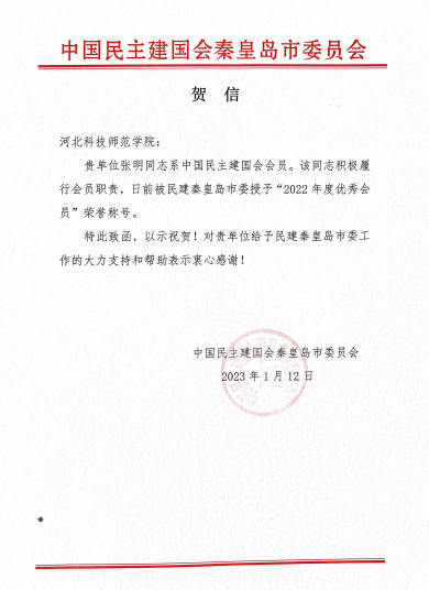 近日,中国民主建国会秦皇岛市委员会向永利发来贺信,感谢学校党委一直以来对民建市委工作的大力支持和帮助。永利中国民主建国会会员张明同志积极履职尽责,被民建市委授予 “2022年度优秀会员”荣誉称号。(编辑:孙艳敏 审核:赵宗宝)