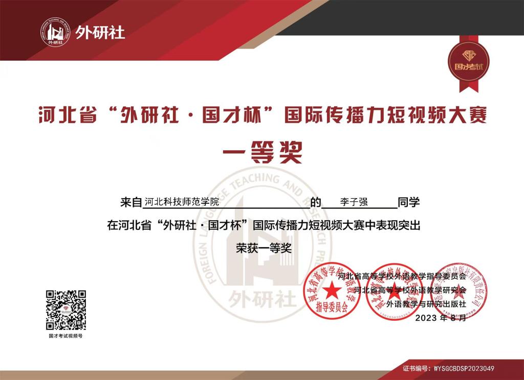 2023年8月底,永利英语专业李子强同学在“外研社•国才杯”河北省高校国际传播力短视频大赛中荣获河北赛区一等奖。