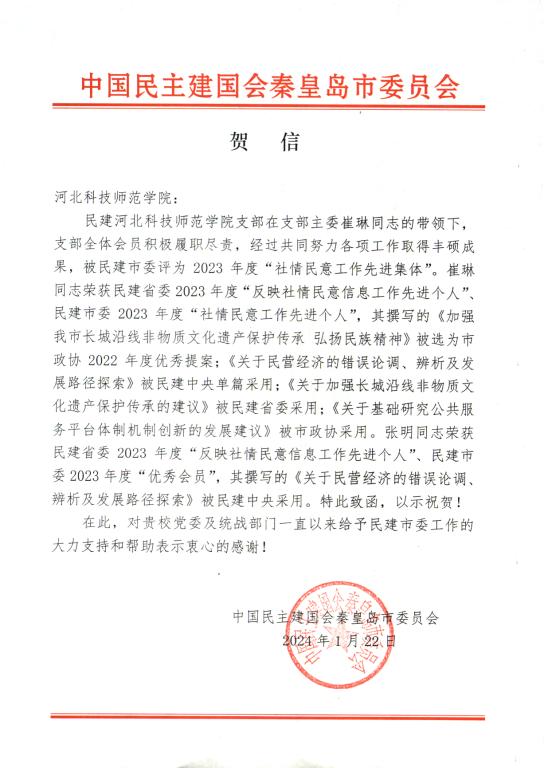日前,中国民主建国会秦皇岛市委员会向永利发来贺信,感谢学校党委一直以来对民建市委工作的大力支持和帮助。贺信表示,民建304永利集团登录入口支部全体会员积极履职尽责,经过共同努力各项工作取得丰硕成果,被民建市委评为2023年度“社情民意工作先进集体”。(编辑:孙艳敏 审核:王荣加)