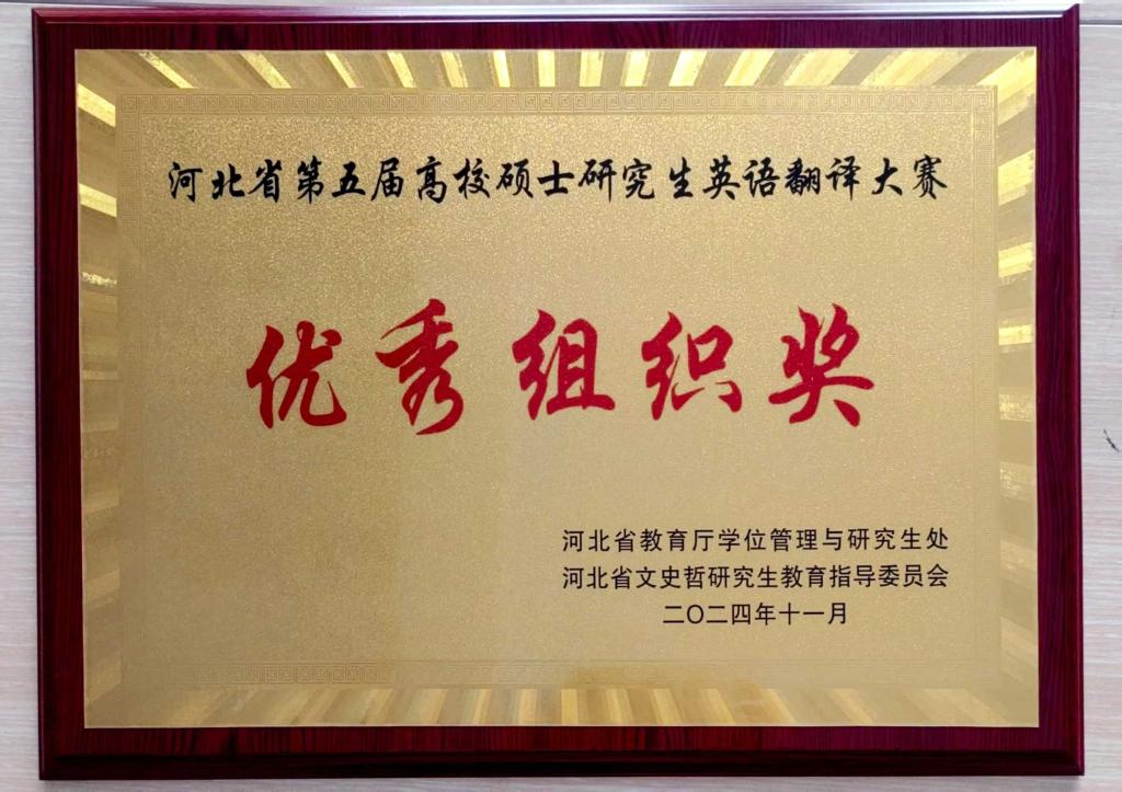 2024年11月1日至2日,河北省第五届高校硕士研究生英语翻译大赛决赛在华北理工大学举办,此次比赛共有来自全省23所高校的154名选手参赛。永利选派的7名研究生在这场激烈的角逐中表现出色,在口译项目中,孙荟茹同学荣获二等奖,王凯伦和谷漫同学荣获三等奖;在笔译项目中,刘悦、段佳欣、杨林威、李子妍四位同学均获得了专业组笔译三等奖。永利获得优秀组织奖。