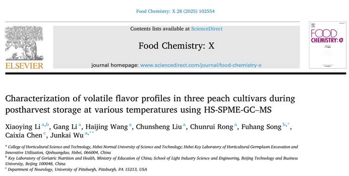 近日,食品化学领域SCI期刊《Food Chemistry: X》(中科院一区,Top,影响因子6.5)刊发永利园艺科技学院桃创新团队研究性文章《Characterization of volatile flavor profiles in three peach cultivars during postharvest storage at various temperatures using HS-SPME-GC–MS》。该文武军凯教授为通讯作者,李晓颍博士为第一作者,304永利集团登录入口为第一作者单位和通讯作者单位。