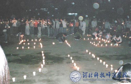 活动在《让世界充满爱》的歌曲声中拉开了帷幕,同学们共同点燃蜡烛,烛光显现出一个巨大的心字形,“5.12”和“川”字在整个心字形的中央闪烁,大家静静默哀三分钟,为逝去的同胞哀悼,为灾区的兄弟姐妹祝福。烛光映照着一张张充满爱意的脸庞,在大家共同祈福和“中国加油”、“汶川加油”的口号声中,同学们唱起了“中华人民共和国国歌”和“祝你平安”等歌曲,歌声感动着在场的每一个人。“不管你在哪里,我都要找到你,不管发生什么样的困难,我们一起度过,加油中国,挺住,四川”,一声声的呐喊响彻夜空,全体同学有着太多的感动,太多的震撼。