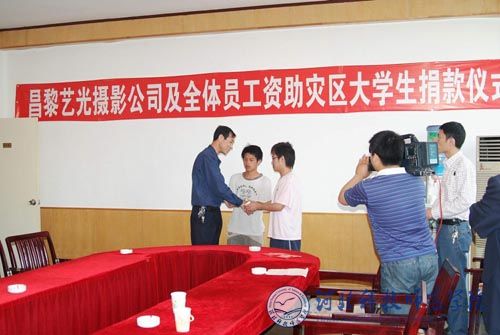 2008年5月22日下午,昌黎艺光摄影公司资助永利两名四川籍地震灾区学子爱心捐赠仪式在昌黎校区举行。学校党委学工部部长、学生处处长张福喜同志代表学校对艺光摄影公司的善举表示了真诚的感谢。昌黎艺光摄影公司董事长陈玉东先生将全体员工捐赠的6000元爱心捐款送到了食品工程系曹军和杨小浪两名学生手中,并鼓励他们好好学习,自强不息,将来用实际行动回报社会,为祖国做出贡献。受助的两名学生表示:一定不辜负艺光摄影公司的无私帮助和学院领导的热情关怀,发愤学习,努力拼搏,以优异的成绩完成学业,将来用更大的爱心回报祖国和人民。