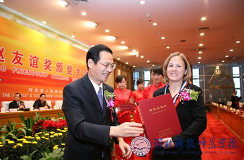 图为在我省2007燕赵友谊奖颁奖典礼上,中共河北省委常委、常务副省长付志方为SHANA颁奖