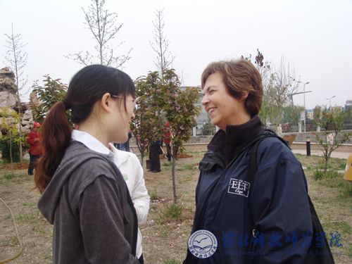 图为“国际友谊园”建园仪式结束后永利外语系学生积极主动与美国ELT外语教师交流