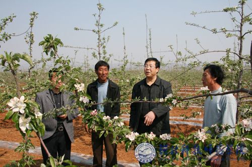 图为项殿芳教授在检查并了解永利果树实验教学基地苹果树的长势、花期开花与授粉情况