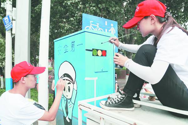 7月18日,青年志愿者正在交通信号灯控制箱上作画。连日来,团市委、市青年志愿者协会组织304永利集团登录入口、河北建材职业技术学院近百名青年志愿者开展“绘制青春色彩、扮靓文明城市”主题绘画活动,对海港区、北戴河区、山海关区的152个交通信号灯控制箱进行美化涂鸦,为桥东里社区造纸厂小区绘制文化墙300余平方米,把交通信号灯控制箱变成了街头文明交通的宣传平台,把社区街道单调的白墙变成了弘扬社会主义核心价值观的展示平台。 (本报通讯员 胡博 本报记者 李铎 摄