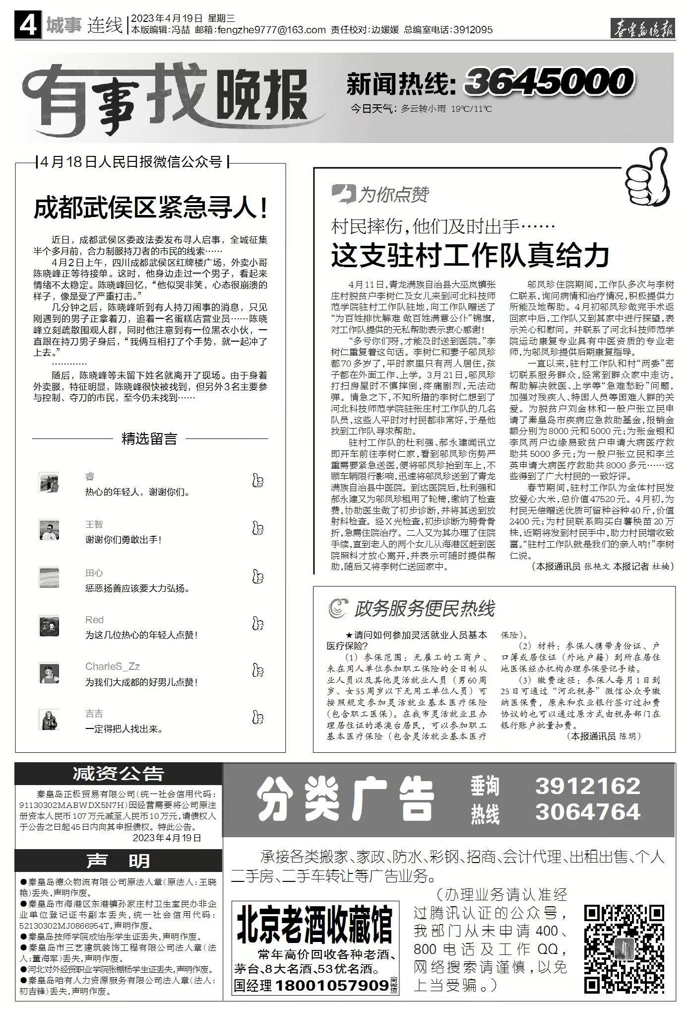 2023年4月19日,《秦皇岛晚报》以《村民摔伤,他们及时出手......这支驻村工作队真给力》为题,报道了永利驻村工作队在青龙满族自治县大巫岚镇张庄村帮助脱贫户就医问诊,展现了排忧解难、真心为民的无私奉献精神。全文如下: