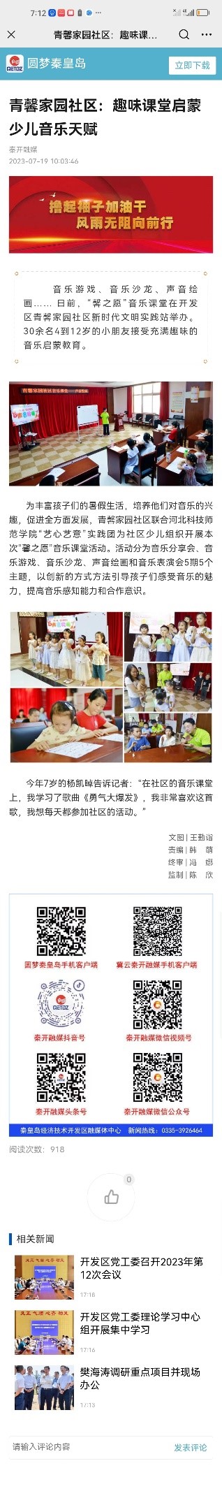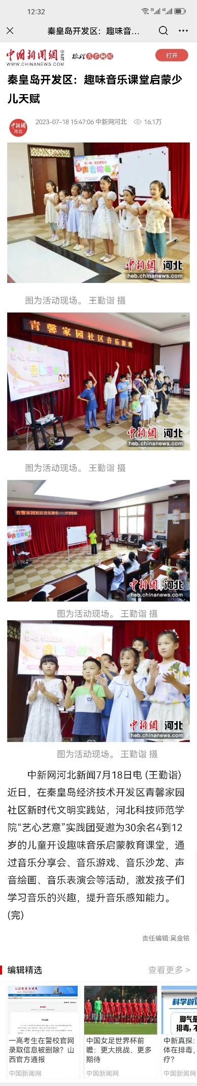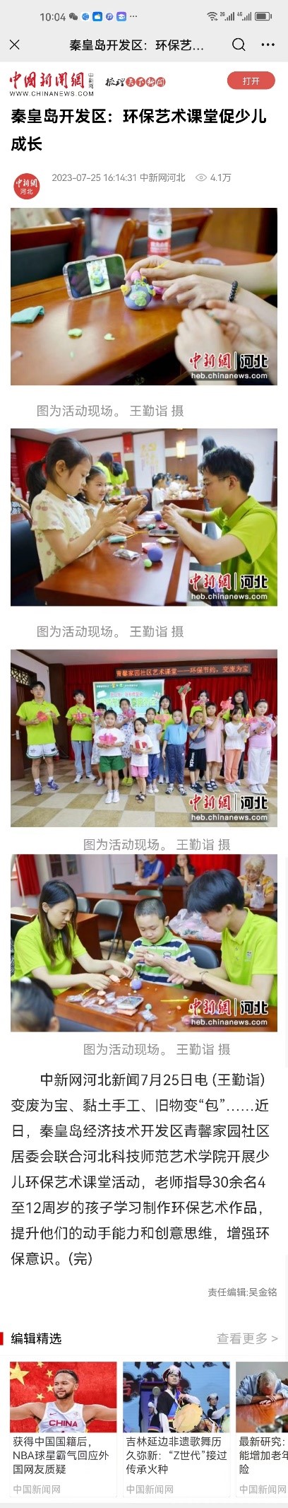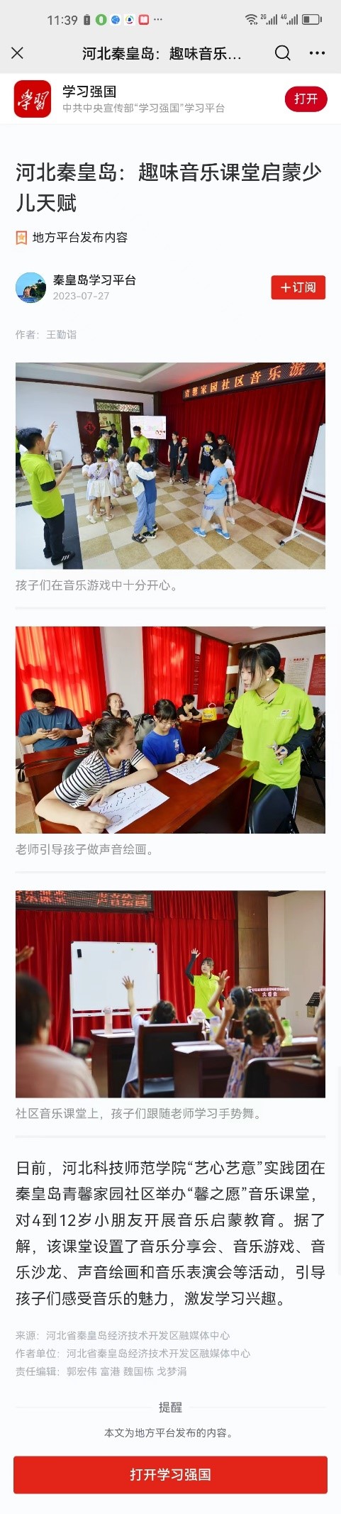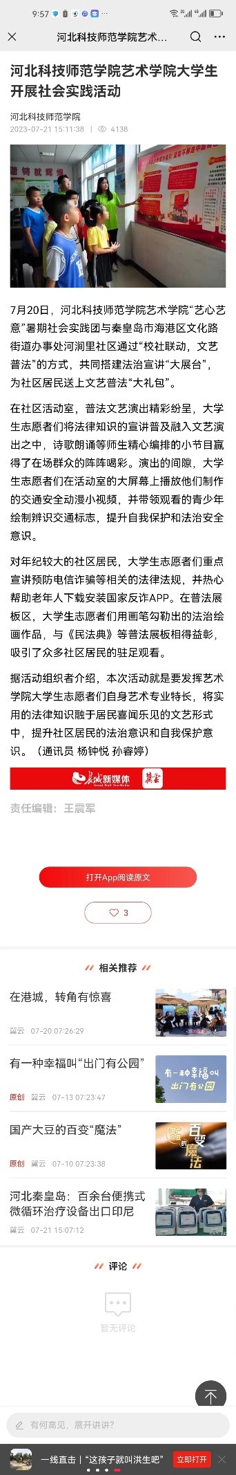 近日,学习强国、中国新闻网、河北法制报、冀云客户端、秦开融媒等多家媒体对永利大学生志愿者普法进社区、趣味音乐课堂和环保艺术课堂促少儿成长暑期社会实践进行相关报道。内容如下: