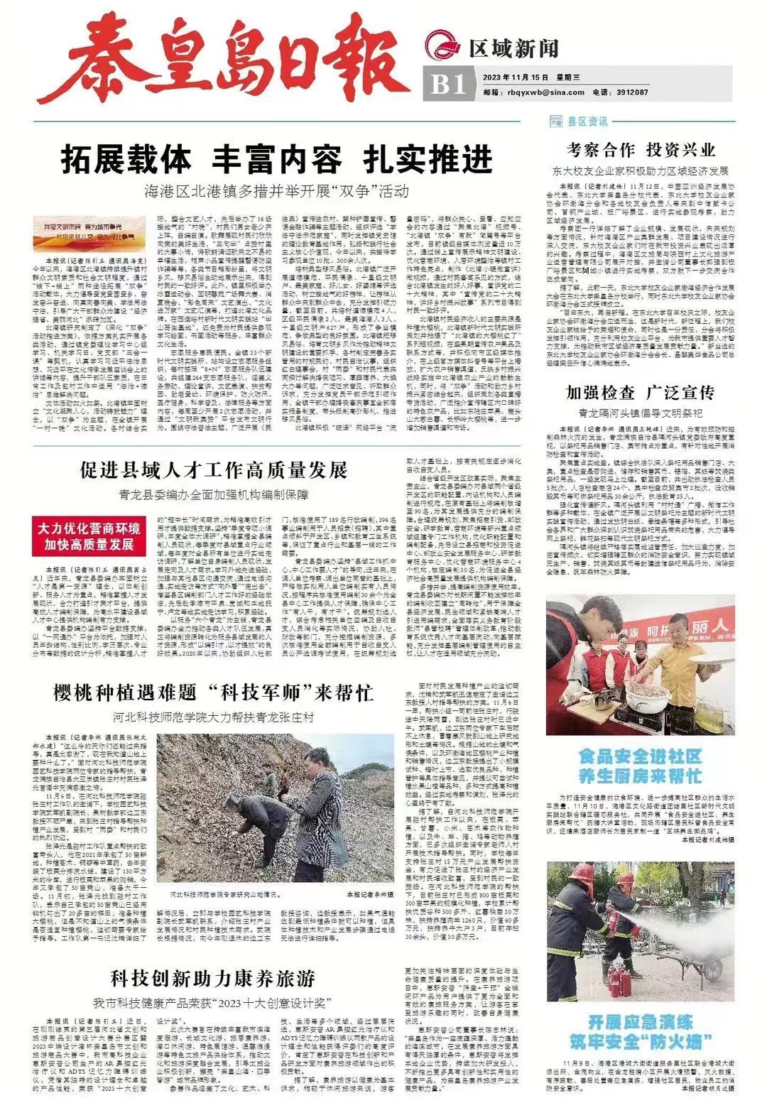 2023年11月15日,《秦皇岛日报》B1版以《樱桃种植遇难题 “科师军师”来帮忙 304永利集团登录入口大力帮扶青龙张庄村》为题,报道永利教师在驻张庄村工作队邀请下,前往帮扶种植产业发展。全文如下