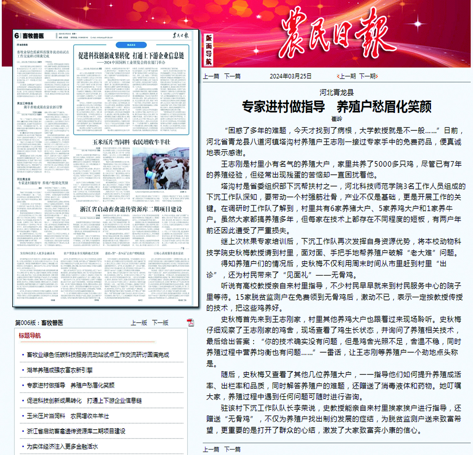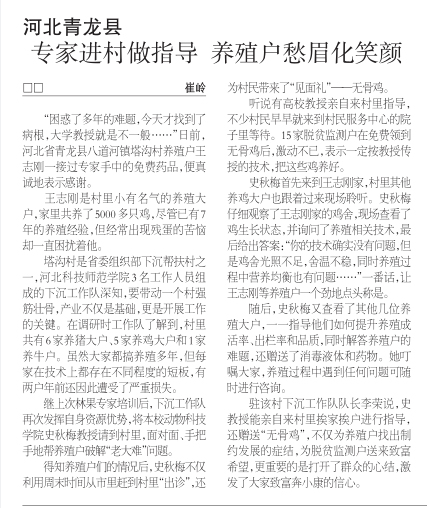 2024年3月25日,《农民日报》第六版《畜牧兽医》栏目,以“河北青龙县专家进村做指导 养殖户愁眉化笑颜”为题,对304永利集团登录入口动物科技学院史秋梅教授走进永利河北省驻青龙县八道河镇塔沟村工作队的村养殖户进行养殖技术指导进行了宣传报道。中国农网均进行了报道。