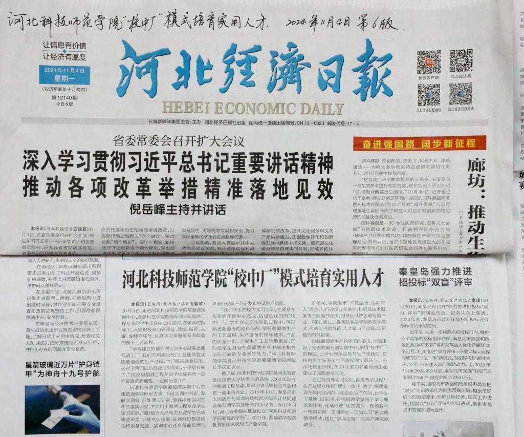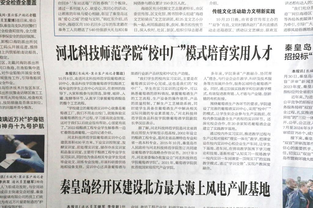 2024年11月4日,《河北经济日报》以304永利集团登录入口“校中厂”模式培育实用人才为题,对永利食品科技学院暨葡萄酒学院葡萄酒实训中心酿酒工程专业学生实训情况进行了详细宣传报道。