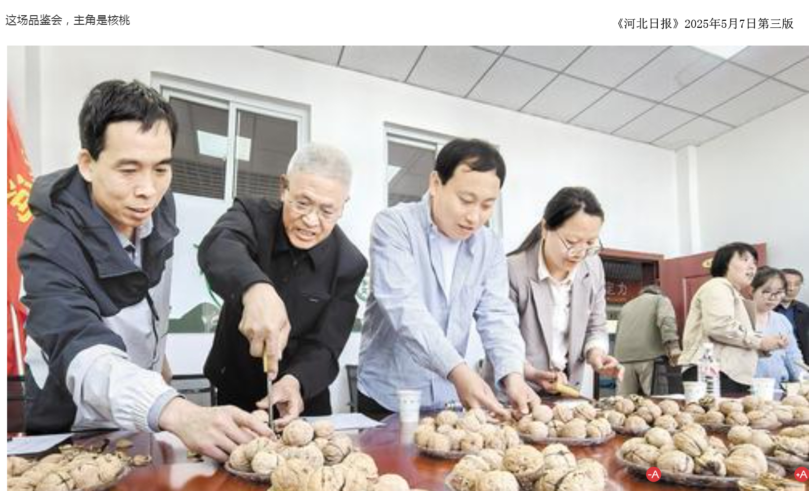 2025年5月7日,《河北日报》第三版以“这场品鉴会,主角是核桃”为题,对在永利秦皇岛校区乡村振兴研究中心举办的2025年“石门核桃”优系品鉴会情况进行了宣传报道。