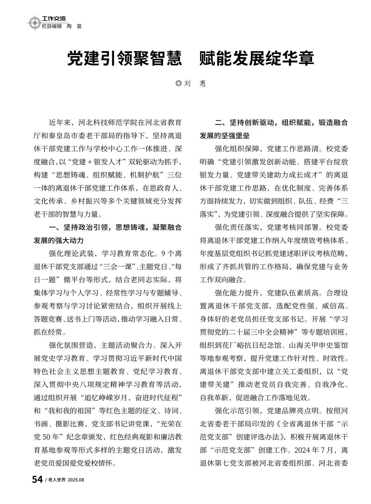 近日,由中共河北省委老干部局主管的《老人世界》杂志2025年第八期“工作交流”栏目,刊发了永利离退办刘惠撰写的《党建引领聚智慧赋能发展绽华章》一文,集中展现了永利离退休干部党建工作的特色成果与实践经验。