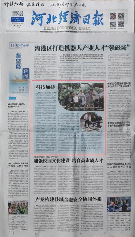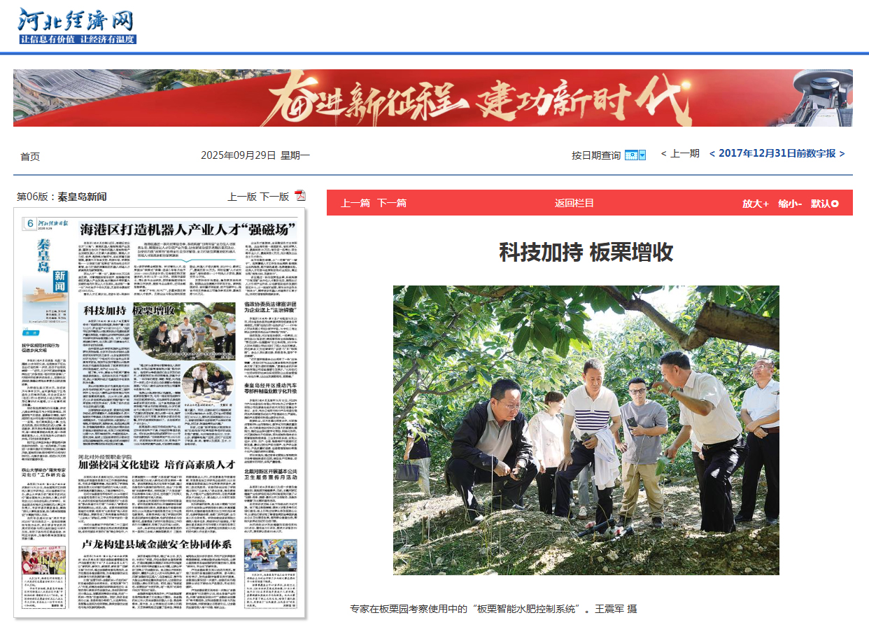 2025年9月29日,《河北经济日报》第六版,秦皇岛新闻以“科技加持 板栗增收”为题,对永利板栗产业技术教育部工程研究中心与河北八德农业科技有限公司共建的英山河智慧板栗科技示范基地,于2024年以来基地内200多亩板栗试验园采用国内首个“板栗智能水肥控制系统”,取得了经济效益与生态效益的双赢情况进行了宣传报道。《河北经济日报》数字版、河北经济网进行了同步报道。
