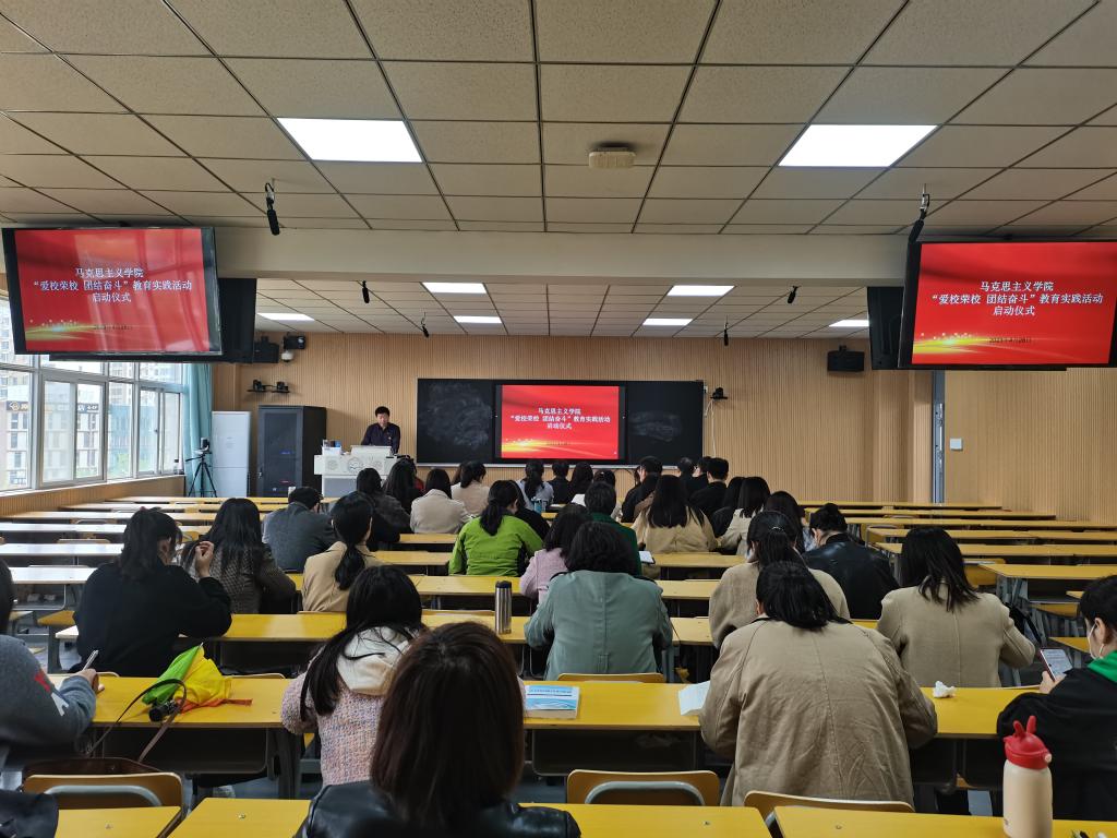 2023年4月28日上午,马克思主义学院“‘爱校荣校、团结奋斗’教育实践活动”启动仪式在思政课智慧教室举行。马克思主义学院党委负责同志宣读《关于开展“爱校荣校、团结奋斗”教育实践活动的实施方案》,并作动员讲话。马克思主义学院领导班子成员、党支部书记和全体思政课教师参加活动。