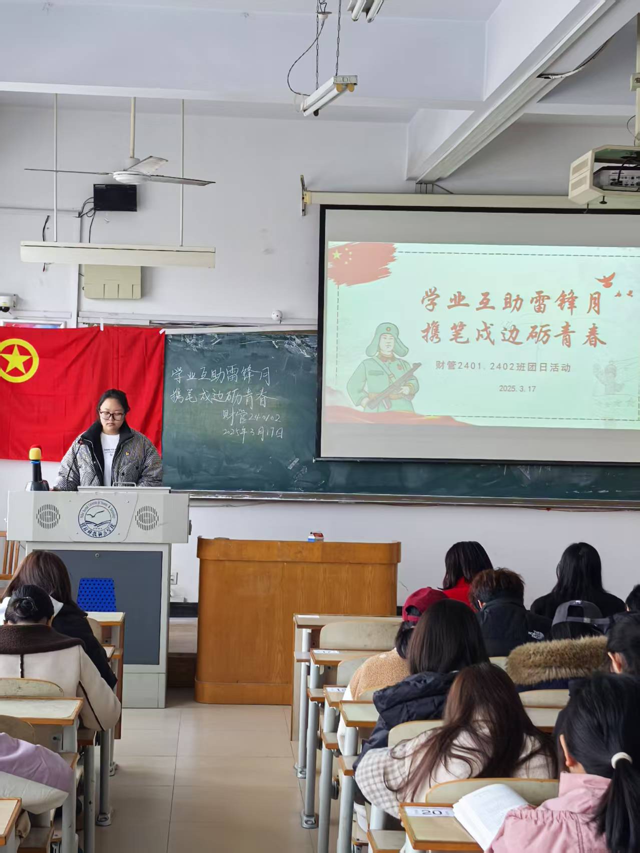2025年3月17日,为弘扬雷锋精神、厚植家国情怀,财经学院财务管理240102班开展以“学业互助雷锋月,携笔戍边励青春”为主题的团日活动。活动通过分享雷锋故事,践行互助精神,学习入伍为国戍边的同学事迹,来激励青年学子以实际行动书写新时代青春篇章。