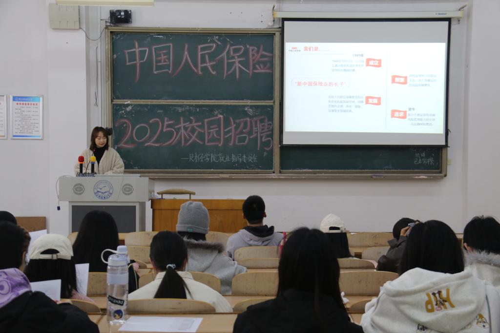 2025年4月8日,财经学院举办中国人民保险2025届校园招聘宣讲会。活动通过企业宣传片、岗位解读及互动答疑等环节,向应届毕业生全面介绍公司发展概况、招聘需求及人才培养体系,为后续招聘工作奠定基础。