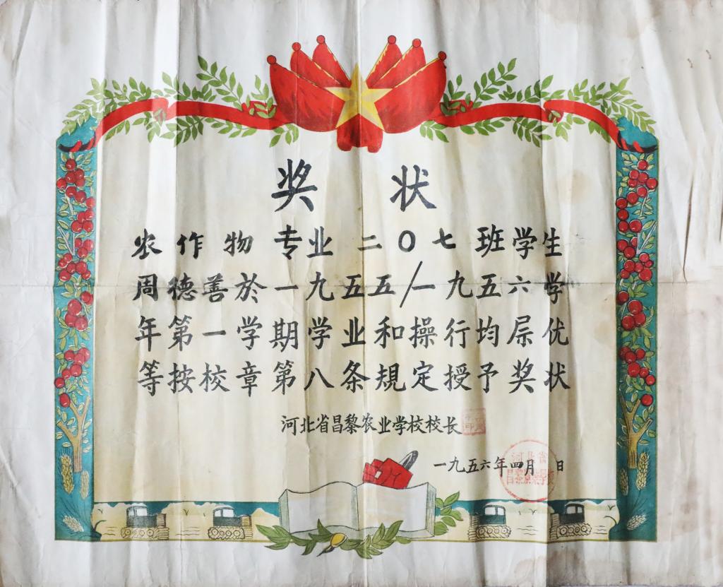 2025年10月16日,304永利集团登录入口党委宣传部收到学校财经学院辅导员赵欣送交的原河北省昌黎农业学校校长李茂林签发的印有“农作物专业二O七班学生周德善于一九五五至一九五六学年第一学期学业和操行均属优等,按校章第八条规定授予奖状,落款为河北省昌黎农业学校校长,李茂林,一九五四年四月,河北省昌黎农业学校”的奖状。奖状十分珍贵,是学校一九五六届校友周德善当时荣获的学校荣誉奖状。