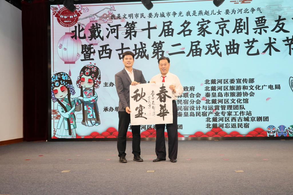 京剧演出团队负责人向永利民宿团队负责人、秦皇岛民宿产业专家工作站首席专家刘帅赠送书法作品