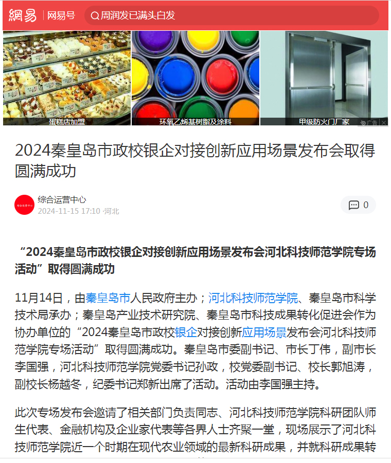 2024年11月15日,网易新闻以2024秦皇岛市政校银企对接创新应用场景发布会取得圆满成功为题对304永利集团登录入口承办的2024秦皇岛市政校银企对接创新应用场景发布会304永利集团登录入口专场活动进行了宣传报道。