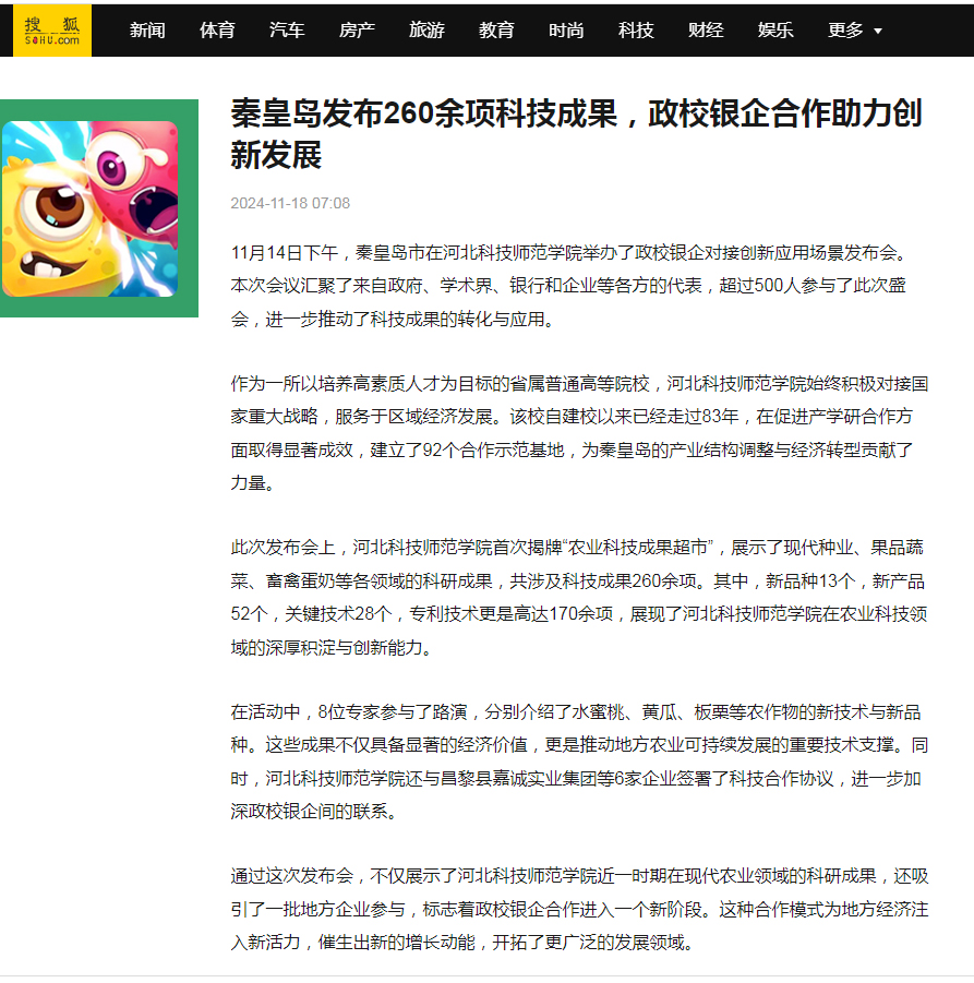 2024年11月18日,搜狐新闻以秦皇岛发布260余项科技成果,政校银企合作助力创新发展为题对304永利集团登录入口承办的2024秦皇岛市政校银企对接创新应用场景发布会304永利集团登录入口专场活动进行了宣传报道。