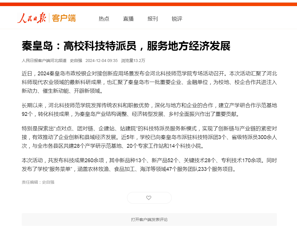 2024年12月4日,人民日报客户端河北频道以高校科技特派员服务地方经济发展为题,对304永利集团登录入口科技特派员服务地方经济社会发展,2024秦皇岛市政校银企对接创新应用场景发布会304永利集团登录入口专场活动情况进行了宣传报道。
