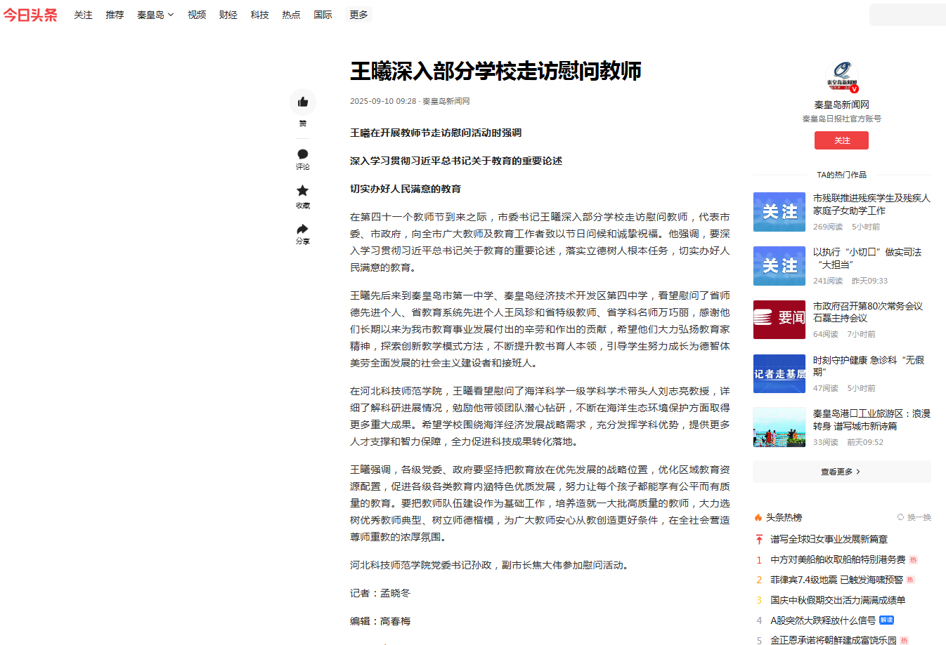 2025年9月10日秦皇岛新闻网宣传报道