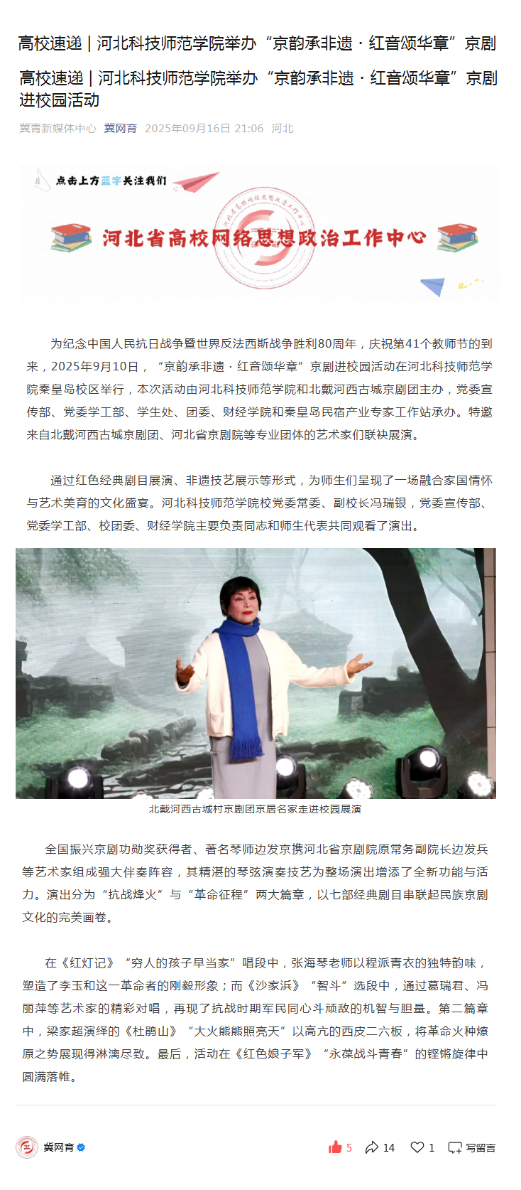 2025年9月16日,河北省高校网络思想政治工作中心网以304永利集团登录入口举办“京韵承非遗.红音颂华章”京剧进校园活动为题,对永利和北戴河西古城京剧团主办,学校党委宣传部、党委学工部、学生处、团委、财经学院和秦皇岛民宿产业专家工作站承办,特邀来自北戴河西古城京剧团、河北省京剧院等专业团体的艺术家们联袂展演情况进行了宣传报道。